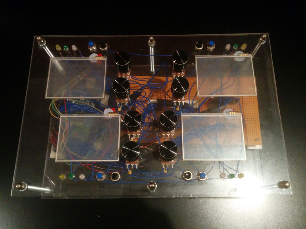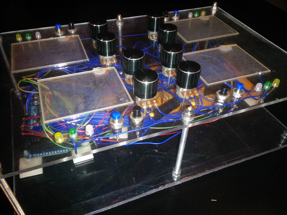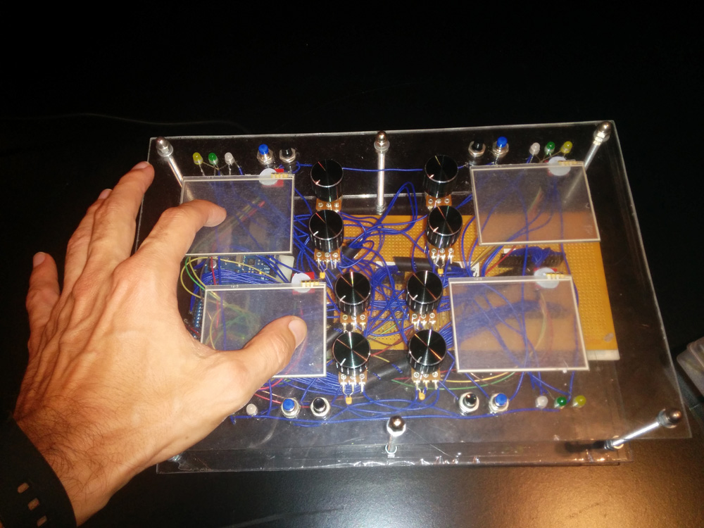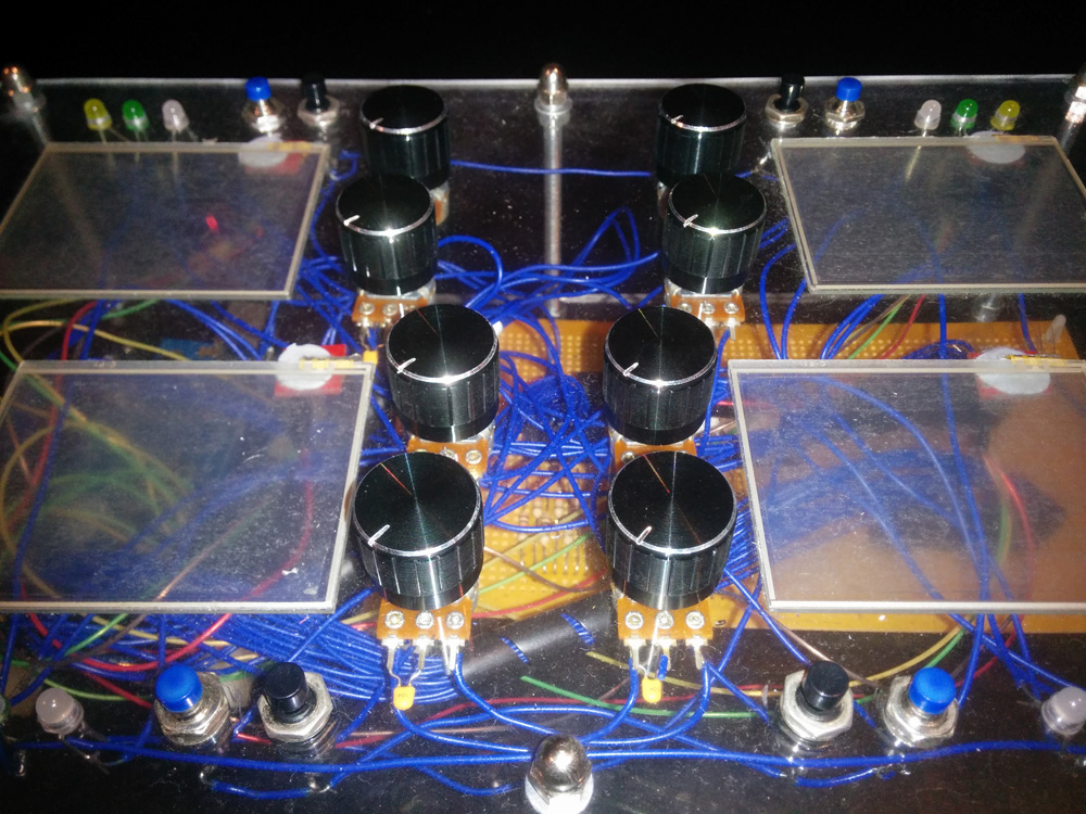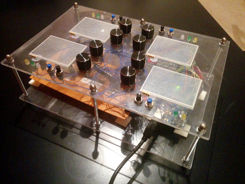 The core of the QuadPad is an Arduino Mega 2560 R3 featuring a high number of I/O pins, and in particular 16 10-bit analog input to interface the 4 touchpads and the eight rotary potentiometers. The Atmega16U2 on the Arduino board is flashed with the Hiduino firmware which turns the USB connection of the board from USB-Serial to USB-MIDI. This makes the QuadPad a plug ‘n play USB MIDI device compatible with most operative system without requiring specific drivers.