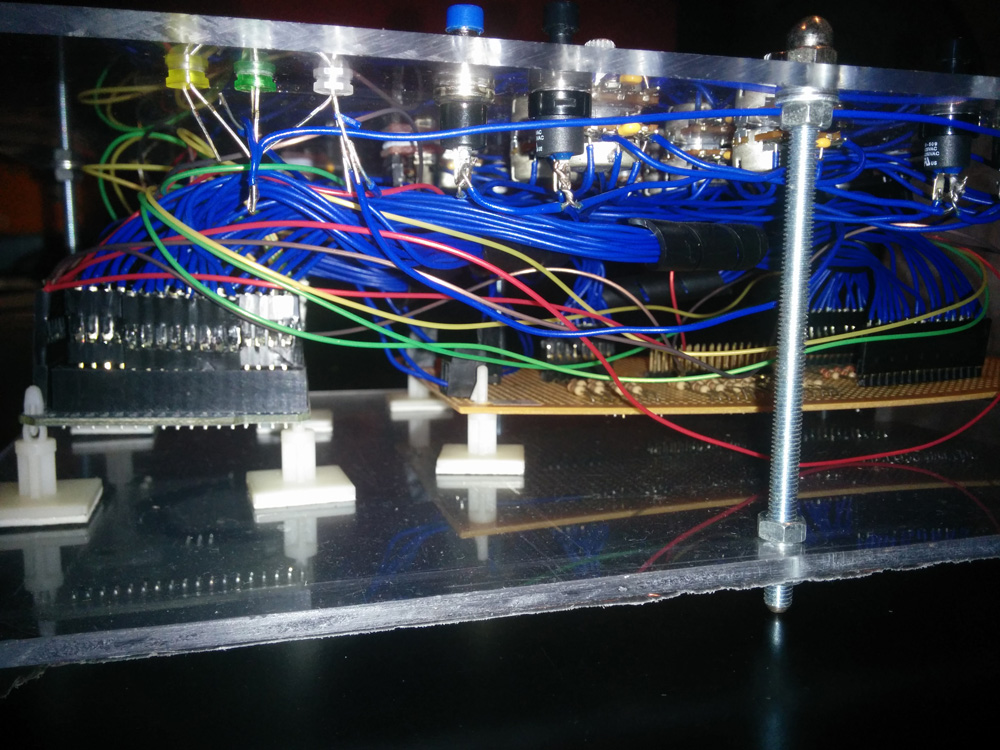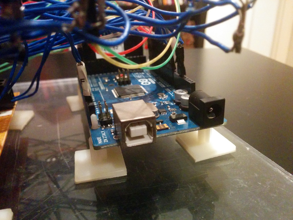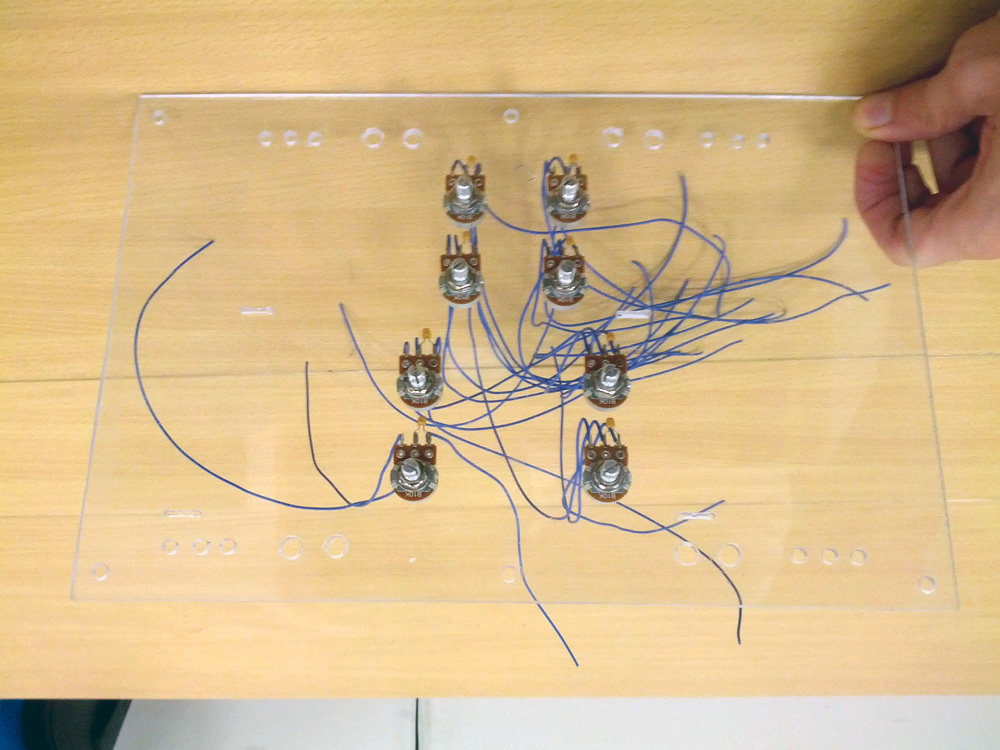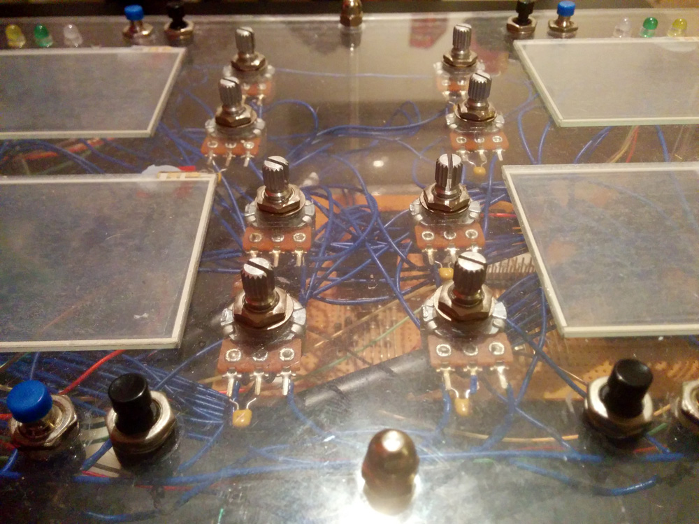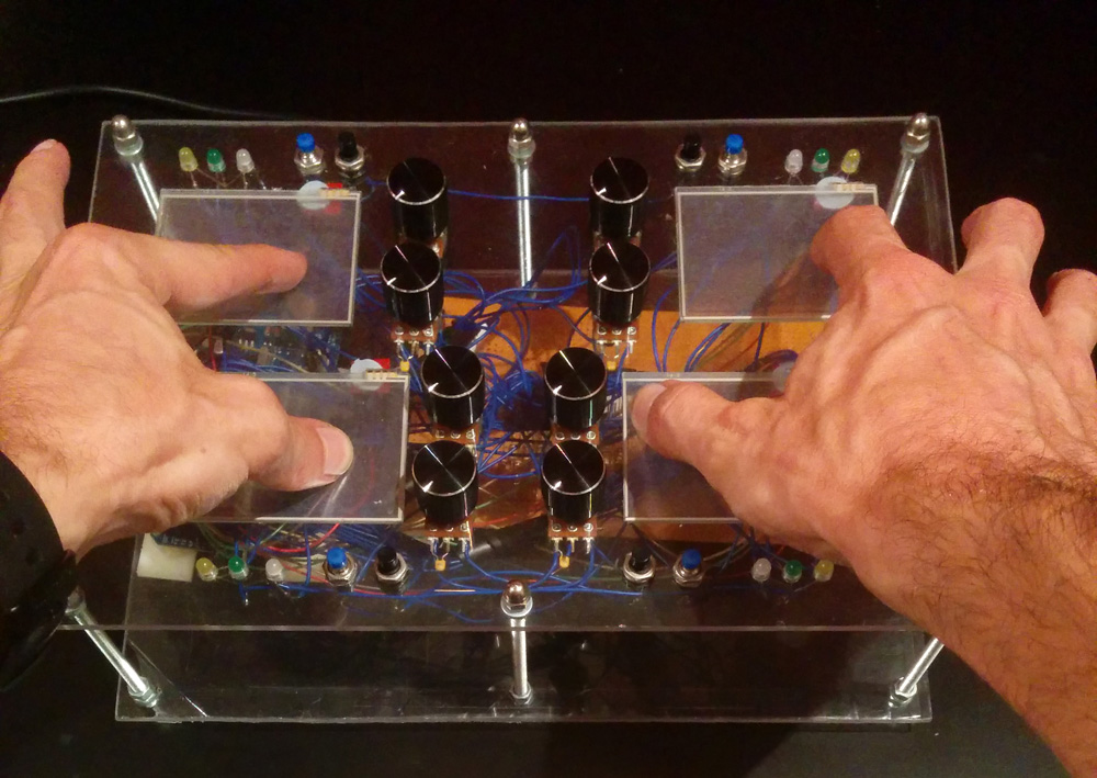 The core of the QuadPad is an Arduino Mega 2560 R3 featuring a high number of I/O pins, and in particular 16 10-bit analog input to interface the 4 touchpads and the eight rotary potentiometers. The Atmega16U2 on the Arduino board is flashed with the Hiduino firmware which turns the USB connection of the board from USB-Serial to USB-MIDI. This makes the QuadPad a plug ‘n play USB MIDI device compatible with most operative system without requiring specific drivers.