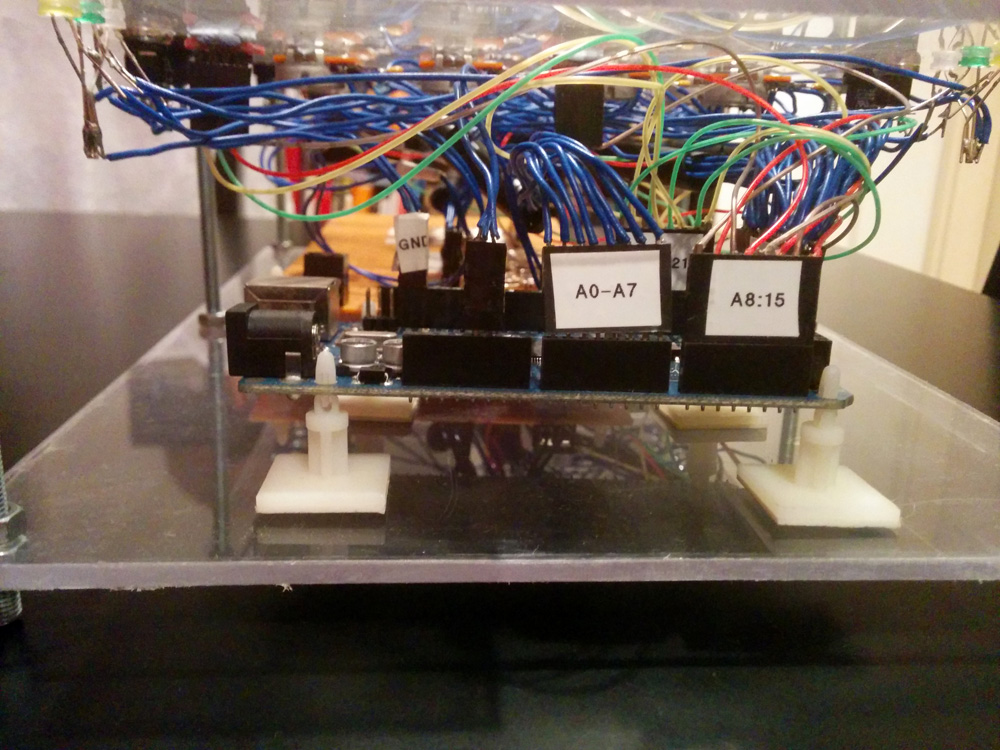 The positive of each LED is connected to the 5V provided by the Mega 2560 board and the negative is connected to a digital I/O pin via a 220Ω resistor. The tri-color LED is essentially one red and one green LEDs packaged together, so that when both are active the light seems yellow. Each tricolor LED has a common positive, connected to 5V and two negative, connected to separates digital I/O of the Mega 2560 through 220Ω resistors. The digital I/Os are set to output and the LED status is toggled changing the pin logical output voltage value using the digitalWrite() function (HIGH=off, LOW=on). Individual LED status is activated sending to the QuadPad specific Note On/Off messages.